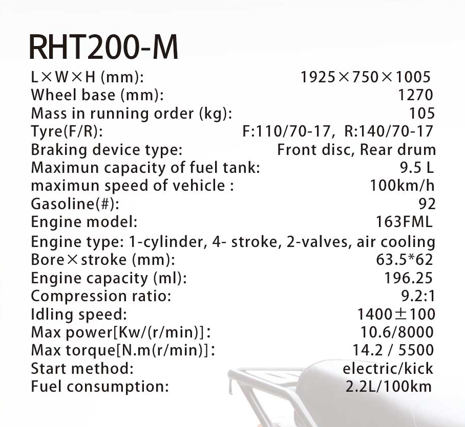 Max.speed: ≥100 Km/h Fuel consumption: 2.2L/100KM