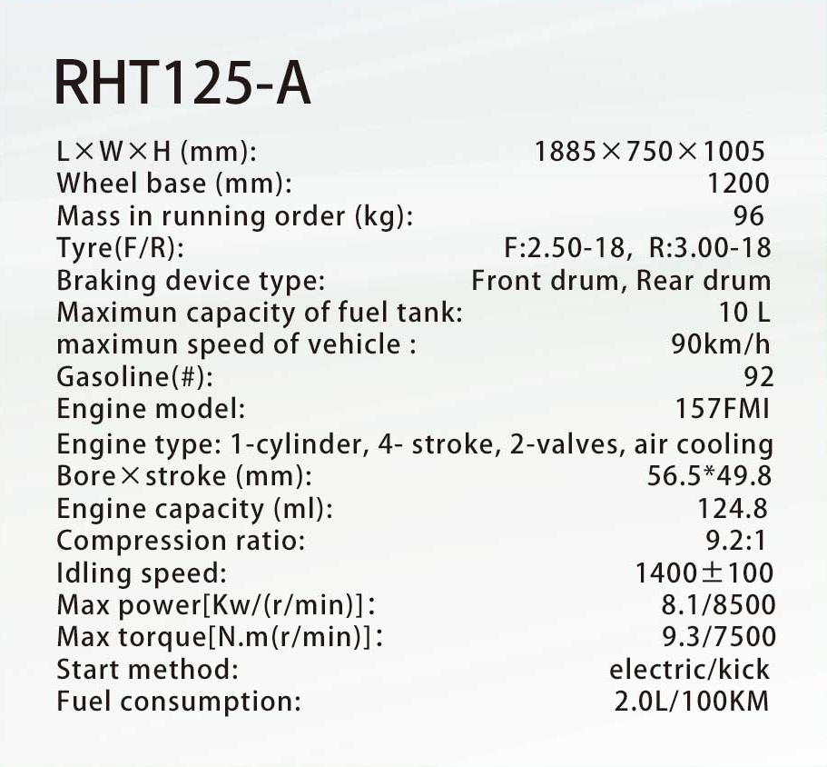 Max.speed: ≥90 Km/h Fuel consumption: 2.0L/100KM