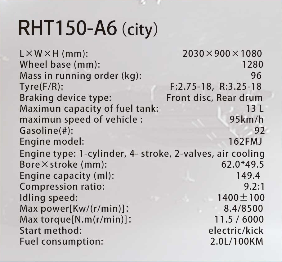 Max.speed: ≥95 Km/h Fuel consumption: 2.0L/100KM