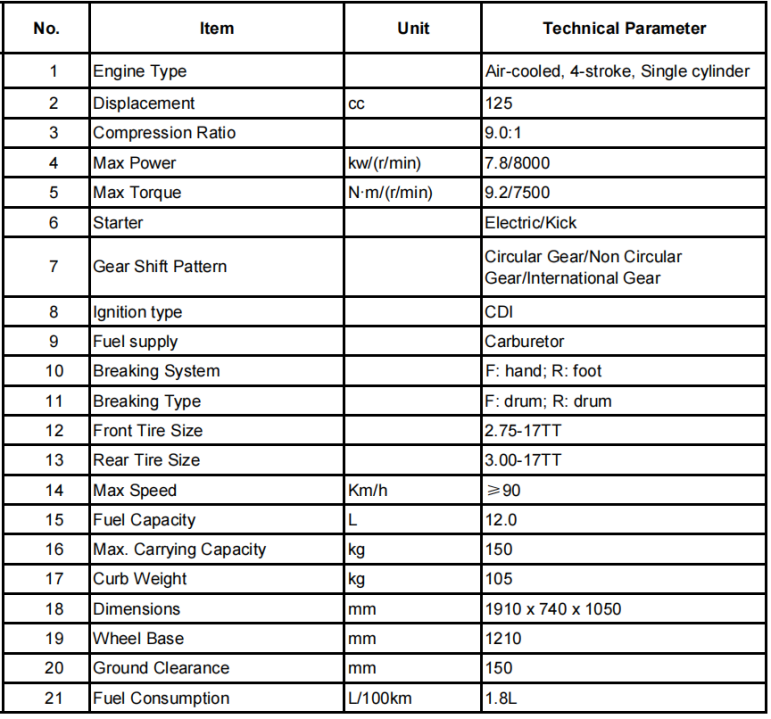 Displacement: 125 cc Max.speed:≥90 Km/h Fuel consumption:1.8L / 100KM